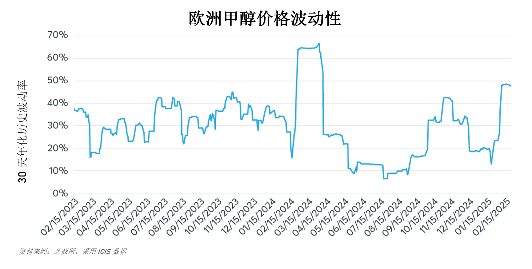甲醇市场价格波动再度加剧,吸引了贸易企业,特别是对这种大宗商品价格剧烈波动敏感的贸易企业入场交易。这一复苏趋势在欧洲市场表现尤为明显,欧洲市场30天年化历史波动率已升至近50%,显着高于2024年同期约27%的水平。虽然中国市场波动率仍处于相对低位,但亚洲和欧洲的甲醇价格走势均充满不确定性。这种不确定性源于甲醇作为一种低碳能源的重要作用日益凸显,吸引更广泛的工业行业进入市场。