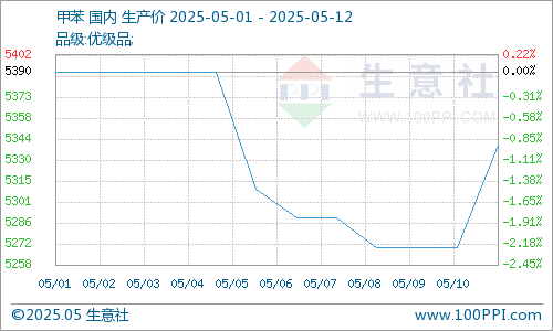 据生意社商品行情分析系统显示,2025年5月1日至5月12日甲苯市场先跌后涨。5月1日甲苯基准价在5390元/吨,5月12日甲苯基准价在5340元/吨,跌0.93%。五一节后原油市场先跌后涨,整体震荡上行,带动甲苯市场气氛,近期市场波动主要受市场气氛影响,来自供应面的影响偏弱。节后山东地区调油市场需求尚可,下游部分入市采购,山东地区炼厂库存普遍偏低位运行,主营炼厂出厂价格普遍上调。华东地区市场心态依旧偏弱,市场交投略显冷清。综合来看甲苯市场本周期先跌后涨,基本跟随原油走势波动。