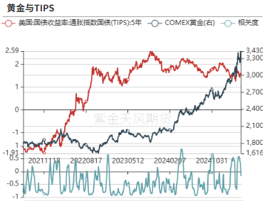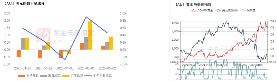 上周美元指数与黄金价格反向变动,黄金上涨2.65%,美元指数上行0.38%至100.42,两者滚动相关性下降。