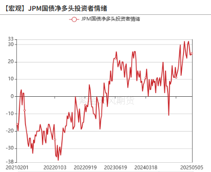 截至5.5当周,JPM国债净多头投资者情绪升至25,较前一周小幅回升。