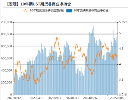 截至5.6的数据,长短端美债利率持仓偏空,2年期UST期货非商业净持仓空头增加14416手至1220793手;10年期UST期货非商业净持仓空头增加81630手至953168手。