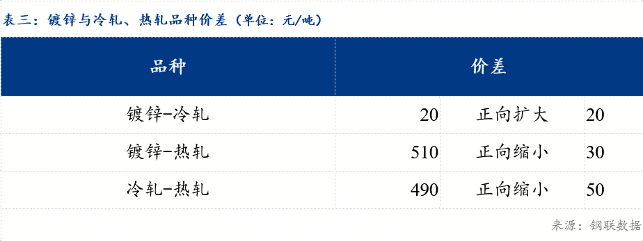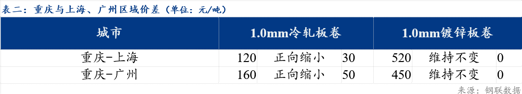 重庆、上海地区冷轧板卷区域价差缩小30元/吨;重庆、广州冷轧板卷区域价差缩小50元/吨。重庆、上海镀锌板卷区域价差维持不变;重庆、广州镀锌板卷区域价差维持不变。镀锌、冷轧品种价差扩大20元/吨;镀锌、热轧品种价差缩小30元/吨 ;冷轧、热轧品种价差缩小50元/吨 。