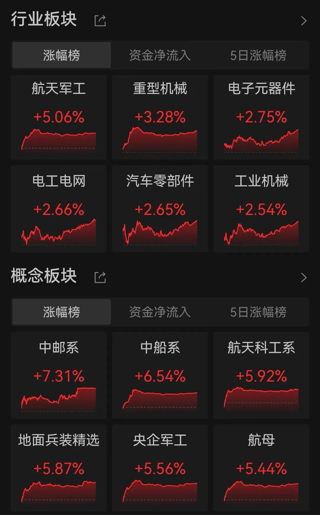 行业板块方面,航天军工板块领涨,中航成飞、晨曦航空、航天南湖、雷科防务、光电股份、国睿科技等相关个股涨停;重型机械、电子元器件、电工电网等板块涨幅居前。
