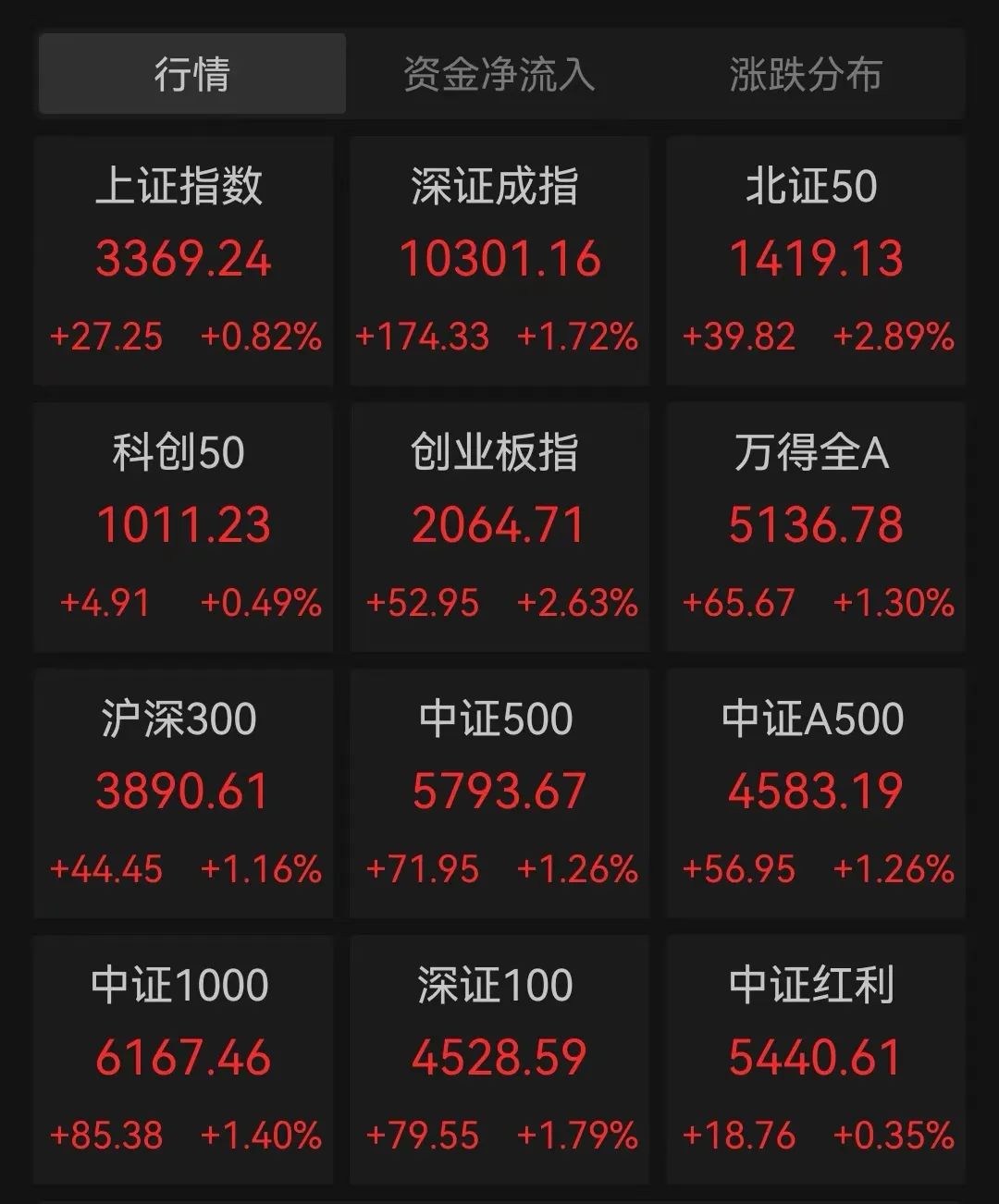 5月12日,A股震荡攀升。截至收盘,上证指数涨0.82%,深证成指涨1.72%,创业板指涨2.63%。A股全日成交13409亿元,较前一交易日增加1185亿元,超4100只个股上涨。