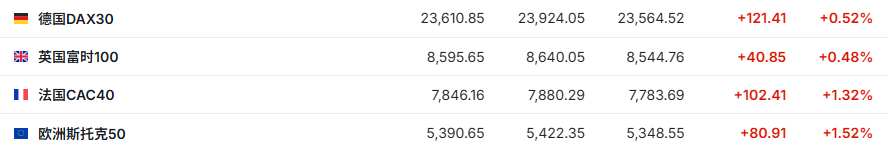 2. 截至发稿,德国DAX指数涨0.52%,英国富时100指数涨0.48%,法国CAC40指数涨1.32%,欧洲斯托克50指数涨1.52%。