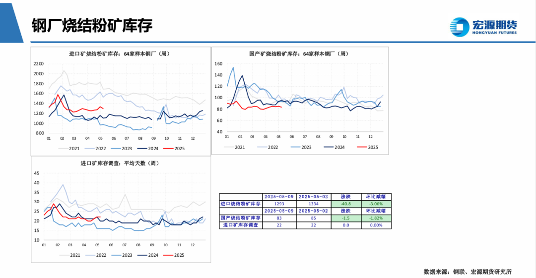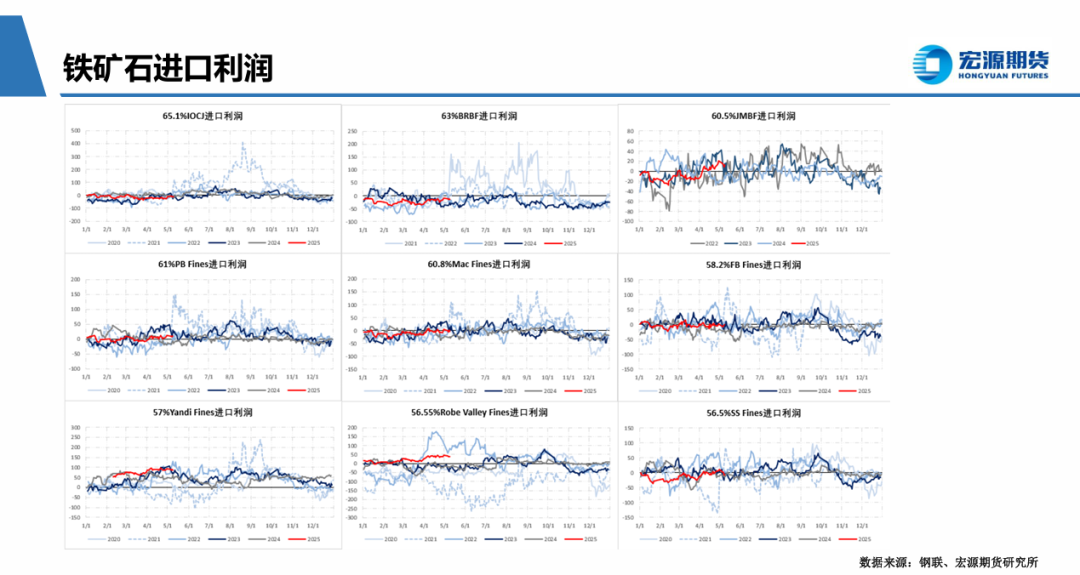 近期中国47港铁矿石近端供应环比回落,处于近三年同期最高水平。根据Mysteel47港铁矿石到港量数据显示,本期值 为2634.4万吨,周环比减少45万吨;5月到港量周均值为2634.4万吨,环比4月增加108万吨,同比去年5月增加124万吨。今年以来,47 港铁矿石到港量累计同比减少2232万吨,其中澳洲累计同比减少760万吨,巴西累计同比减少612万吨,非主流累计同比减少860万吨。根据 模型测算及近期天气预测,预计下期到港量小幅下降。