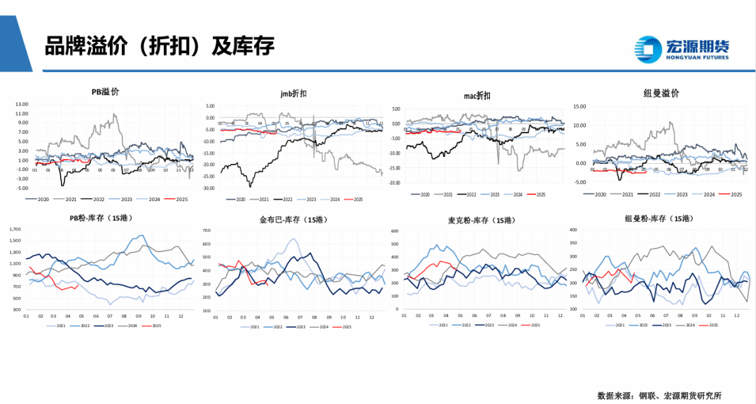 上周铁矿现货价格松动,下跌幅度在3-10元不等。具体来看,卡粉(-5),PB粉(-4),BRBF (-6),金布巴(-3),超特粉 (-10),mac(-7)。块矿方面,PB块(-5) ,纽曼块(-9),乌克兰/俄罗斯造球精粉(-7) 。普氏62%指数方面,截止5月9日,普 氏指数收于98.6美元,周环比回升1.7美元,目前按汇率7.24折算人民币大致在832元左右。仓单方面,截止5月9日,最优交割品为BRBF 粉,目前最新报价在765元/吨左右,折算仓单(厂库)为769元/吨左右,09铁矿贴水现货,除BRBF粉之外,次优交割品为NM粉(772)。