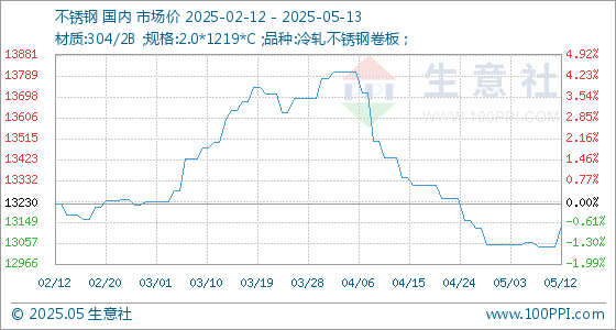5月13日生意社不锈钢基准价为13130.00元/吨