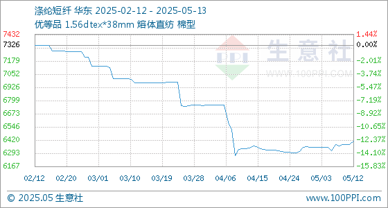 5月13日,生意社涤纶短纤基准价为6411.79元/吨,与本月初(6351.46元/吨)相比,上涨了0.95%。