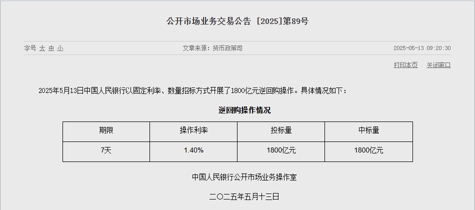 5月13日,央行网站发布公告,中国人民银行以固定利率、数量招标方式开展了1800亿元逆回购操作,投标量1800亿元,中标量1800亿元,操作利率为1.40%。因今日有4050亿元逆回购到期,当日实现净回笼2250亿元。