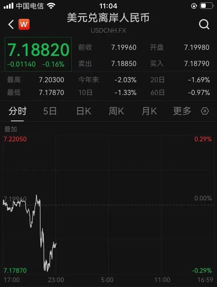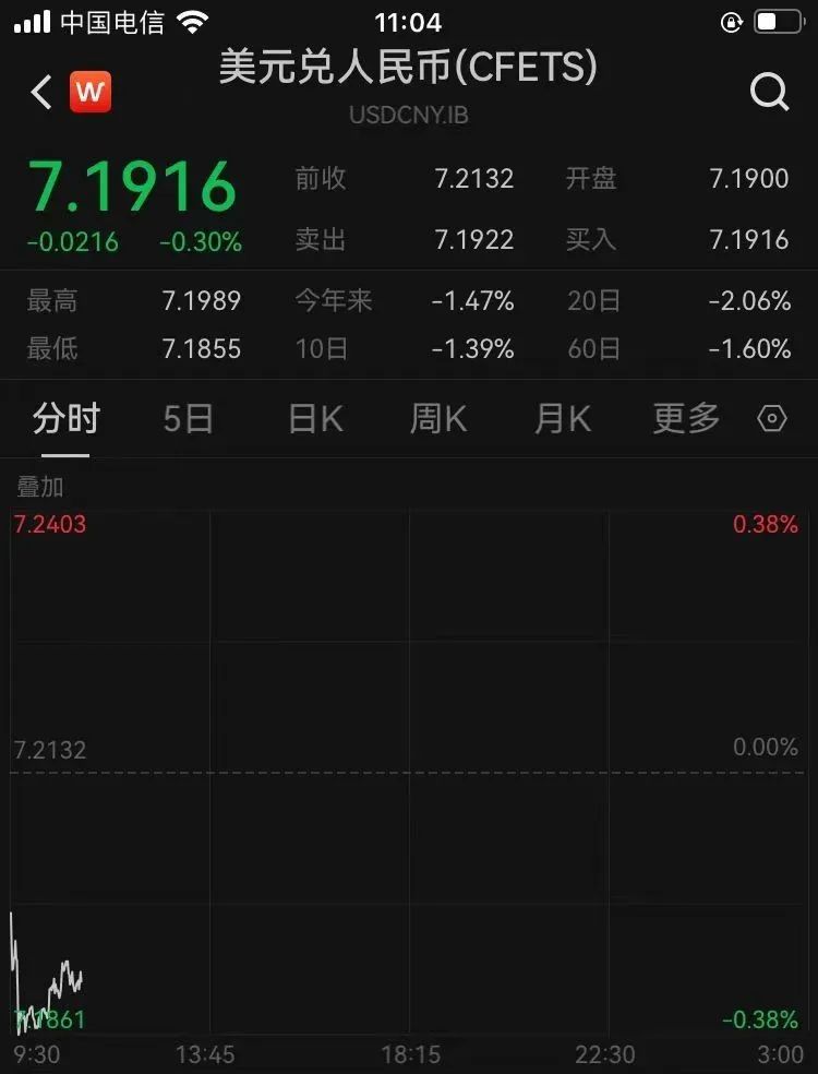 在岸、离岸人民币汇率双双升值,截至发稿,在岸人民币对美元报7.1916,大涨216个基点;离岸人民币对美元一度升破7.18关口,截至发稿报7.1882,大涨114个基点。