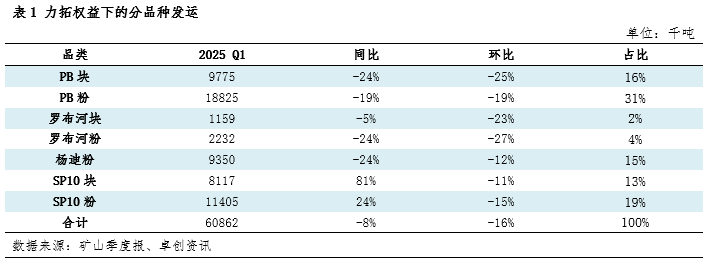分产品来看,一季度SP10产品的发运占比进一步上升至19%(100%权益),其余品种的发运均出现下滑,其中主力产品PB粉的发运同比和环比下滑幅度均达19%。