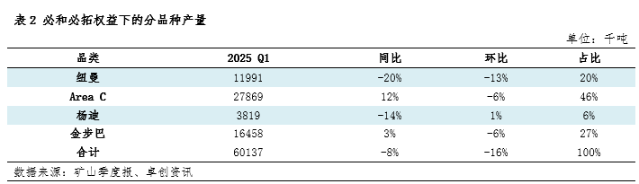 分品种来看,同比方面,必和必拓权益下,一季度除了C矿区的产量增长外,其余矿区均有不同程度的下滑,其中杨迪下滑最为明显;环比方面,除了杨迪矿区外,各矿区的产量均有所增长。