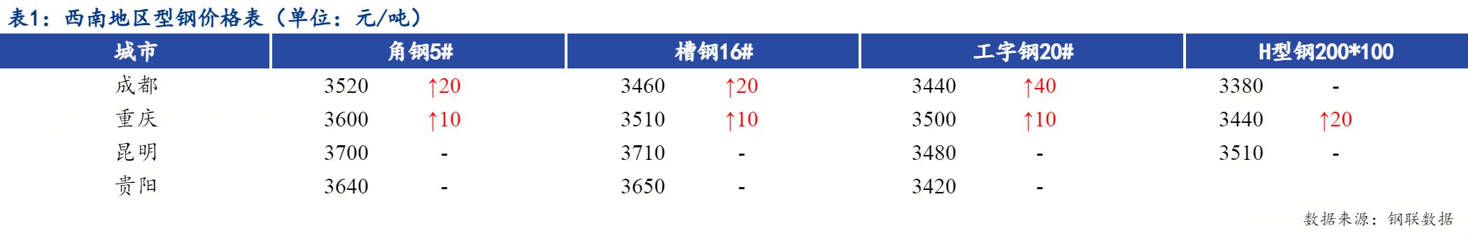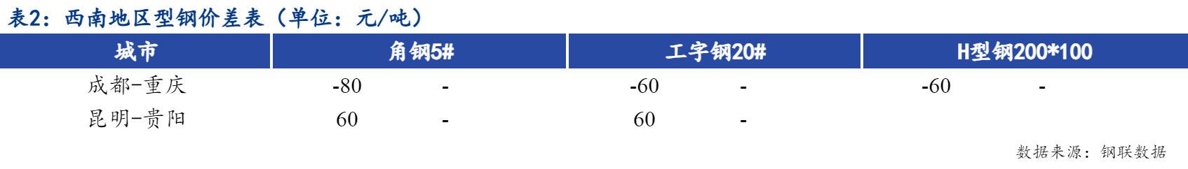 成都与重庆角钢价差收窄,工字钢价差收窄,H型钢价差扩张;昆明和贵阳角钢价差不变,工字钢价差价差收不变。