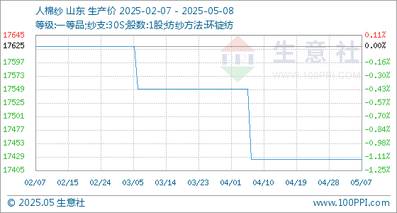 5月8日,生意社人棉纱基准价为17425.00元/吨,与本月初持平。