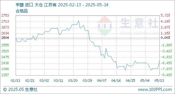 5月14日,生意社甲醇基准价为2453.75元/吨,与本月初(2440.00元/吨)相比,上涨了0.56%。