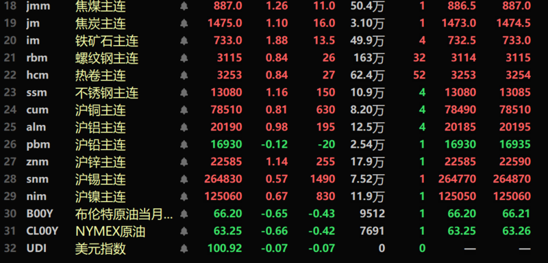 黑色系均飘红,铁矿涨1.88%,不锈钢涨1.16%。螺纹和热卷均涨0.84%。双焦方面:焦煤涨1.26%,焦炭涨1.1%。