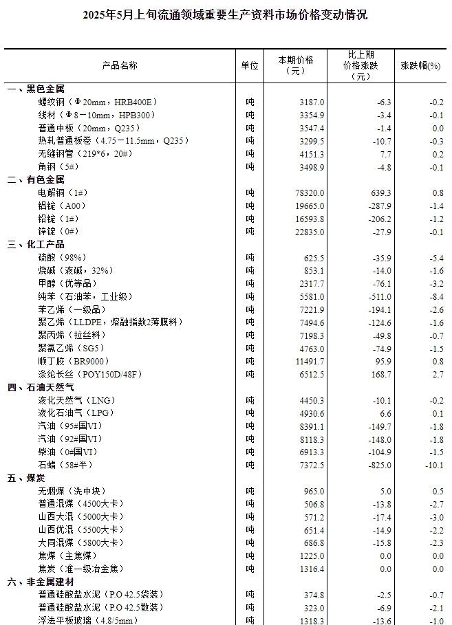 【国家统计局:5月上旬流通领域重要生产资料市场12种产品价格上涨】财联社5月14日电,国家统计局今日发布2025年5月上旬流通领域重要生产资料市场价格变动情况。据对全国流通领域9大类50种重要生产资料市场价格的监测显示,2025年5月上旬与4月下旬相比,12种产品价格上涨,32种下降,6种持平。