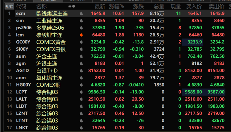 截至午间收盘,欧线集运主力合约涨10.61%,报1645.9点。