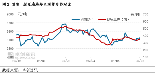 国内压榨企业开工逐步回升,豆油供应趋于恢复,而下游在淡季内刚需补货为主,基本面支撑有限令现货基差趋弱,制约了现货价格涨幅。根据5月9日发布的《供应压力后置,豆油将开启累库趋势》,可以了解到5月后国内大豆压榨企业随着原料到港增加及大豆通关加快,企业开工负荷率回升至50%以上,豆油产出渐宽松,市场提货压车现象逐步缓解,需求端看,淡季内下游刚需补货,且因对后期供应宽松预期一致,采购相对谨慎。因此现货基差有所松动。截至13日,港口一级豆油现货基差343元/吨,较上一交易日走弱5元/吨,基差出现阴跌,制约现货价格上行空间。