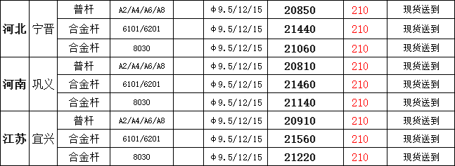 5月14日宁晋市场普铝杆现货报盘价20850元/吨,较上一交易日报价涨210元/吨;巩义市场普铝杆现货报盘价20810元/吨,较上一交易日报价涨210元/吨;宜兴市场普铝杆报盘价20910元/吨,较上一交易日报价涨210元/吨。