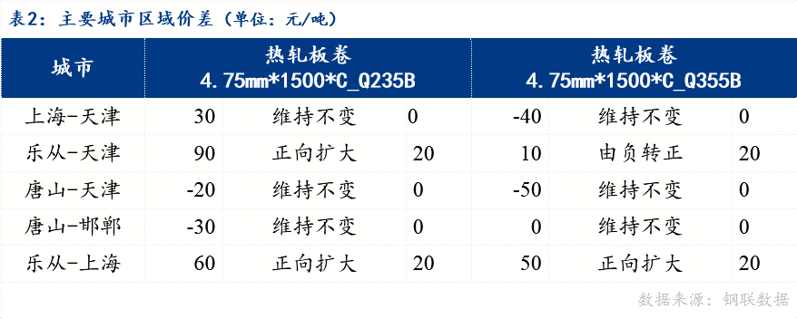 从区域价差来看,4.75mm普卷华南与华北价差90元/吨,华东与华北价差30元/吨,华南与华东价差60元/吨。京津冀地区价差来看,唐山与天津价差-20元/吨,唐山与邯郸价差-30元/吨。