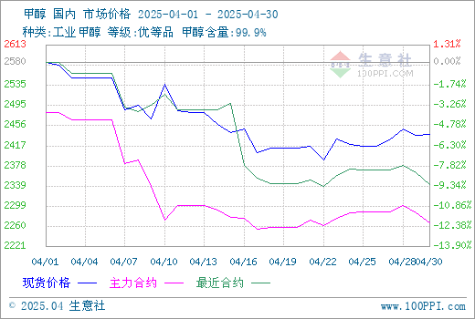 据生意社商品行情分析系统,国内甲醇市场行情偏弱震荡,4月1日至30日(截止下午15:00),国内甲醇市场华东港口均价自2580元/吨下跌至2440元/吨,周期内价格跌幅5.43%,最大振幅7.36%,价格同比下跌7.98%。
