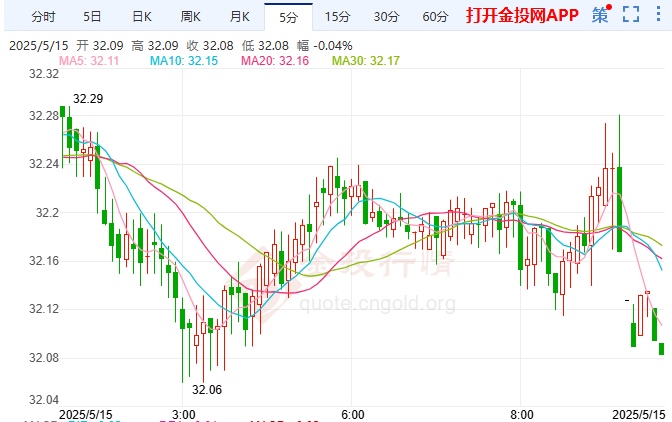 今日周四(5月15日)亚盘时段,国际白银目前交投于32.06一线上方,今日开盘于32.23美元/盎司,截至发稿,国际白银暂报32.09美元/盎司,下跌0.37%,最高触及32.29元/盎司,最低下探32.08美元/盎司,目前来看,国际白银盘内短线偏向震荡走势。