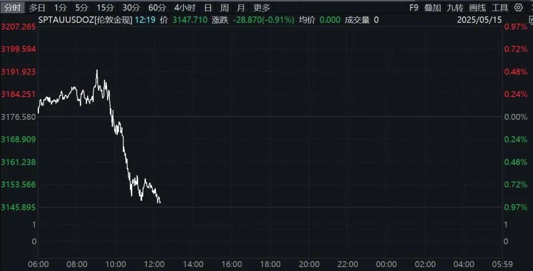 今日盘中,现货黄金拉升后再度跳水,跌破3150美元/盎司,较日高回落逾43美元。截至发稿,下跌逾0.9%。
