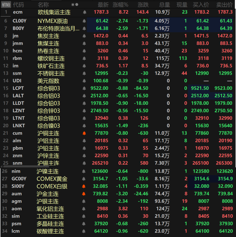 此外,碳酸锂主连跌0.96%,多晶硅主连跌0.68%,工业硅主连涨0.36%。欧线集运主连大涨8.72%。