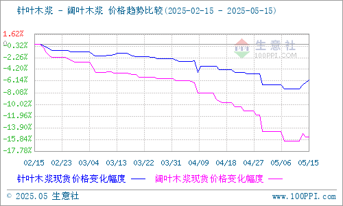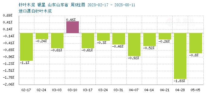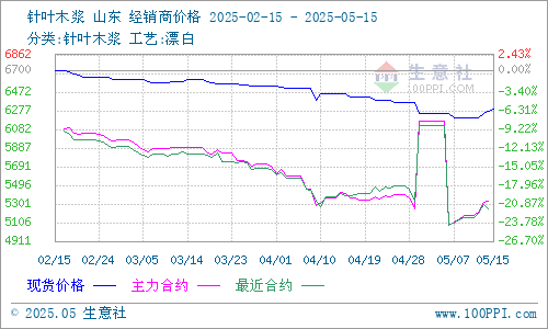 据生意社商品行情分析系统监测:本周针叶木浆和阔叶木浆价格均呈现止跌回涨的状态。5月15日针叶木浆山东地区市场均价为6300元/吨,与5月11日均价相比上涨了1.61%。5月15日阔叶木浆山东地区市场均价为4200元/吨,与5月11日均价相比上涨了0.8%。