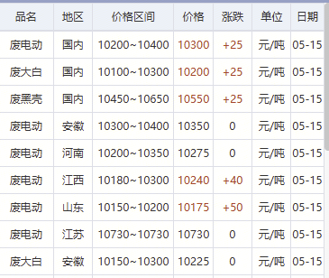 今日铅价上涨,安徽、 江西等地部分炼企上调废电瓶报价,主流地区废电动不含税价报10050-10100元/吨上下;回收端反馈货量不多,出货意愿仍不佳;预计短期废电瓶价格将维持高位运行。