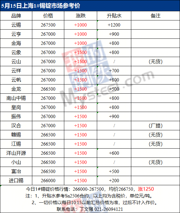 5月15日Mysteel上海现货锡锭报价266000-267500元/吨,均价266750元/吨,较上一交易日涨1250元/吨,Mysteel15:30上海现货锡锭成交价格264500-266500元/吨,均价265500元/吨,较上一交易日持平。