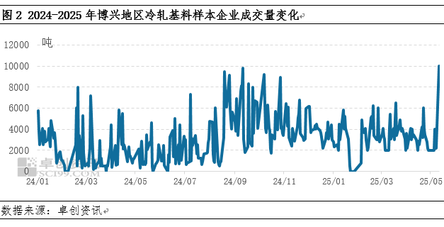 见图2,卓创资讯对博兴市场样本大户成交情况统计,可以发现,其实今年以来市场行情几番波动,但成交量始终未能出现较大的突破。主要原因在于三点,一是博兴市场货源多来自河北区域,在盈利不佳背景下,部分下游选择从河北直发,减少出库成本;二是市场贸易商在行情无较大的波动背景下,自身库存也是积极的控制在可控范围内,以降低较高库存带来资金风险;三是下游企业补库情绪谨慎,多按需采购为主,呈现少量多批次采购模式,即每天的采购量不会过高,但每月采购的频度较高。
