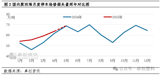 供应来看,目前PP仍处于上半年检修集中期,供应端对市场仍存在较强支撑。据卓创资讯数据统计,目前国内PP装置停车比例高达17%-20%,预计5月PP检修损失量仍在年内高点,在68万吨左右,短线检修装置的集中将较大程度的缓解供应端的压力。