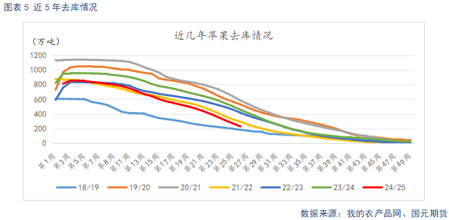 据我的农产品网统计,截止2025年5月7日,主产区冷库库存为228.86万吨,周度去库37.92万吨,周去库速度环比放缓。当前剩余库存量,对比过去6年,除了18年倒春寒导致全国大规模减产的18/19果季,整体处于历史低位。且库存结构中,果农货占比不大,而客商货有渠道、订单,销售压力相对较小。低库存成为价格下方的坚实支撑。五一过后,节日效应退潮,叠加夏季时令水果逐步上市,终端对高价果的接受度不高,苹果走货放缓,市场对果价继续提涨的预期不强。