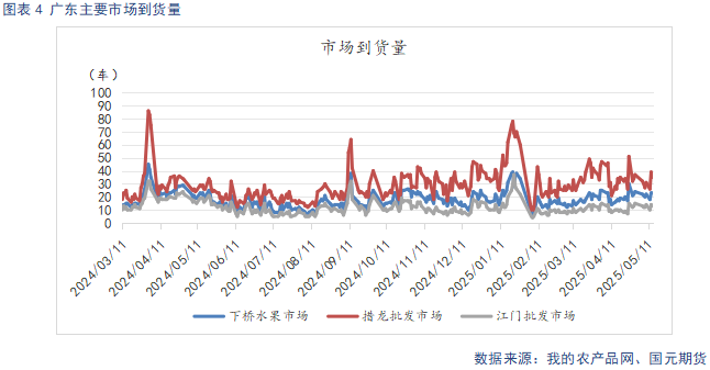 截止5月15日,洛川70#半商品均价4.8元/斤,价格较上周环比上涨0.5元/斤;栖霞80#一二级均价4.1元/斤,较上周环比持平。截止5月15日,广东主要苹果批发市场日均到货23.6车。清明、五一双节期间,叠加剩余库存处于低位,市场看涨情绪升温,产区报价稳中偏强。不过五一过后,终端走货放缓,市场到车量下滑,现货价格趋于平稳。