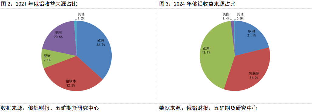 从2024年俄铝的主要客户分布来看,亚洲地区是其最大的销售市场,2024年占比42.9%,欧美对于俄铝的制裁造成其将铝锭更多地销往亚洲地区,中国是主要目的地,2024年俄铝来自中国的收益占比达30.7%,而2021年仅为6.4%。