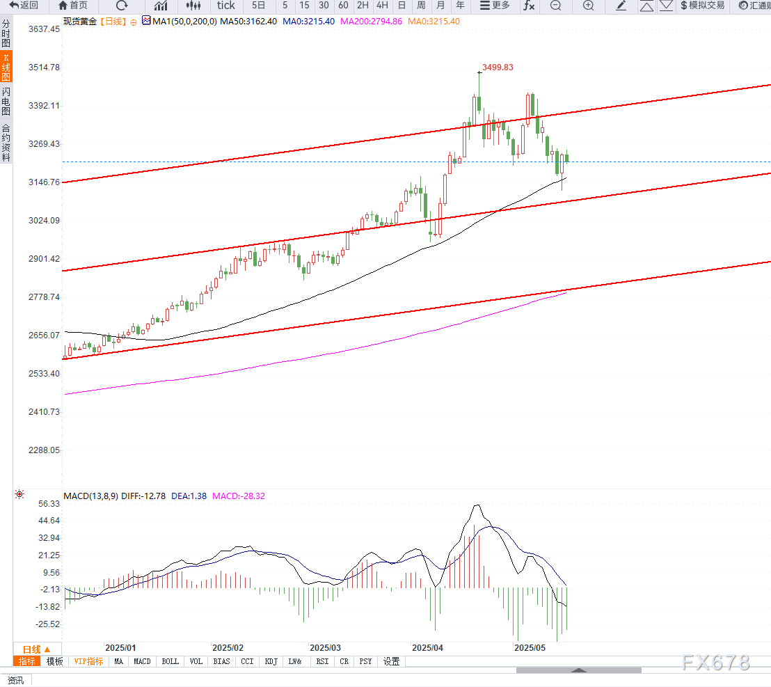 金价日线图显示,目前仍处于自高点回落的下行趋势中,此前在200周期4小时均线附近(3252-3255美元)遇阻未能突破,短期反弹动能明显不足。