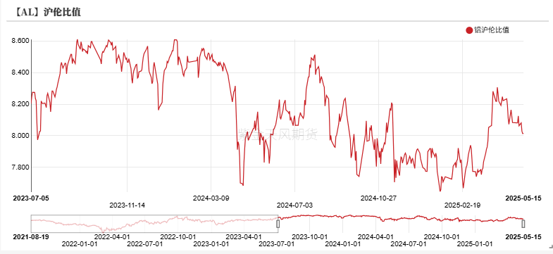 进出口方面,收到宏观情绪好转的影响,伦铝价格本周大幅上涨,沪伦比值下探至。8.02,铝锭进口利润大幅收敛;