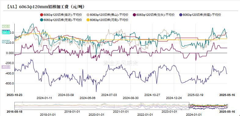 铝棒出库速度较前一周放缓,上周铝棒出库4.66万吨,较前一周减少0.4万吨/周;铝棒加工费方面,本周一各地铝棒加工费有所回落,无锡地区加工费由450/吨跌至320元/吨,佛山地区加工费由400元/吨落至290元/吨,包头地区加工费为100元/吨。