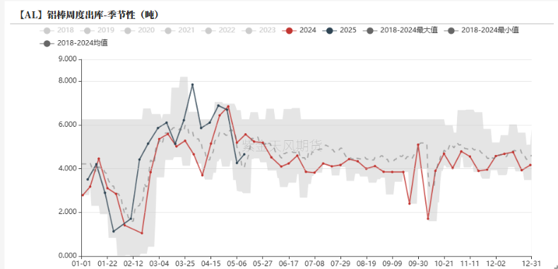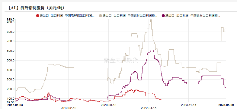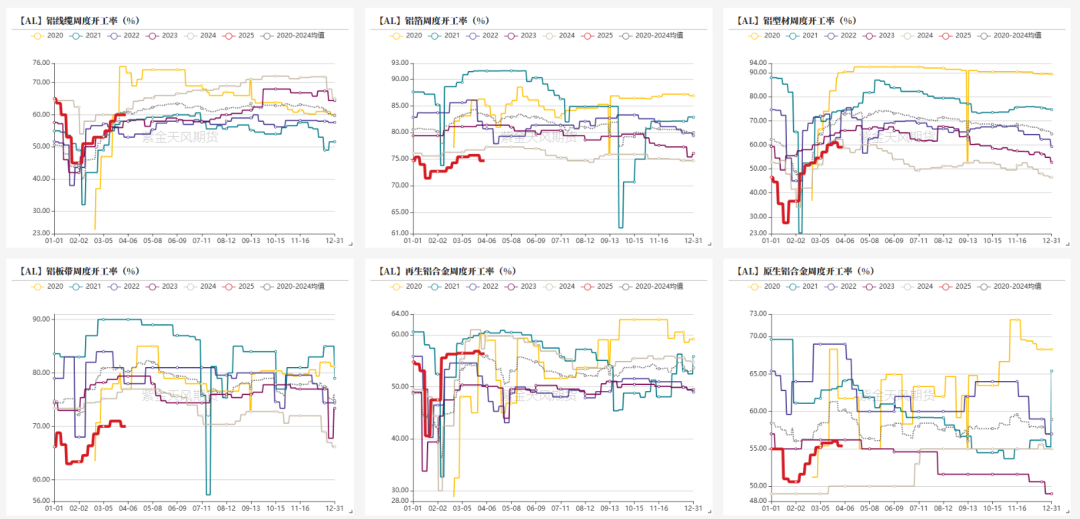 分板块来看,随着市场走出传统消费旺季以及4月关税的逐步兑现,铝下游开工率整体回落,上周个板块中铝线缆板块开工率整体较为坚挺,其开工率仍保持在65.2%,其余板块均有明显回落,其中出口相关的铝箔、铝板带开工率分别回落67.2%、71.1%;随着光伏开工的减弱,铝型材板块开工率回落56.5%。
