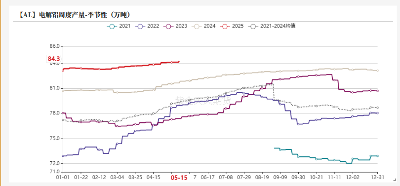 电解铝产量方面,上周电解铝产量为84.3万吨/周,较上周增加0.3万吨;