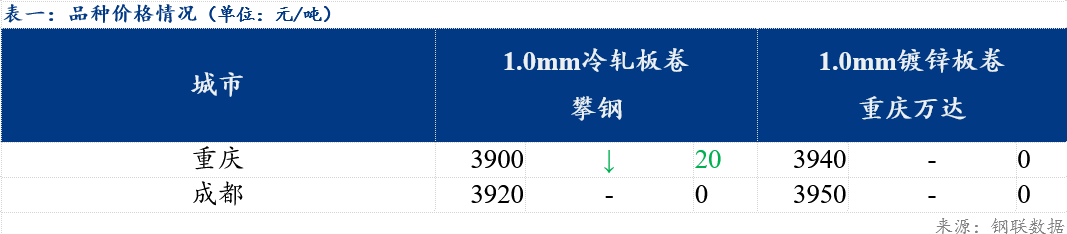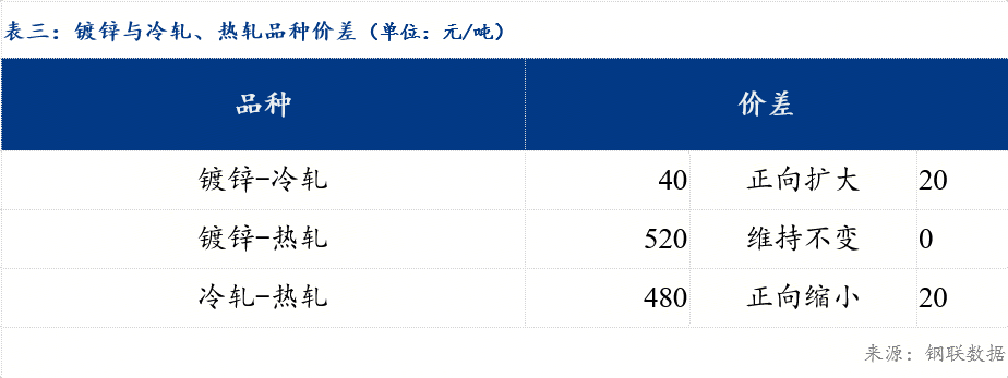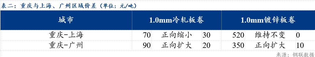 重庆、上海地区冷轧板卷区域价差缩小30元/吨;重庆、广州冷轧板卷区域价差扩大20元/吨。重庆、上海镀锌板卷区域价差维持不变;重庆、广州镀锌板卷区域价差扩大10元/吨。镀锌、冷轧品种价差扩大20元/吨;镀锌、热轧品种价差维持不变 ;冷轧、热轧品种价差缩小20元/吨 。