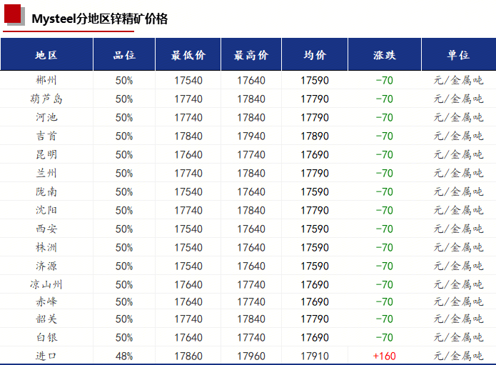 今日受锌价的影响,锌精矿价格下降70元/金属吨,各地区加工费无调整。进口TC市场主流报价在30-50美元/干吨,和上一交易日持平。