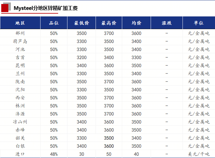 华北地区:内蒙古某锌锭生产企业50品位的锌精矿加工费3400元/金属吨到厂。