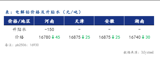 5月16日全国市场1#铅锭价格报16775元/吨,较上一交易日下跌25元/吨。炼企现货市场报价方面,其中河南济源市场持货商沪铅2506合约报贴水150元/吨出厂;湖南市场炼企对铅现货均价贴水波动不大,炼厂报贴水20-50元/吨出厂,安徽市场炼企对铅现货均价报升水100元/吨出厂,升水上调。江西市场炼企对铅现货均价报升水下调,报升水80元/吨出厂。