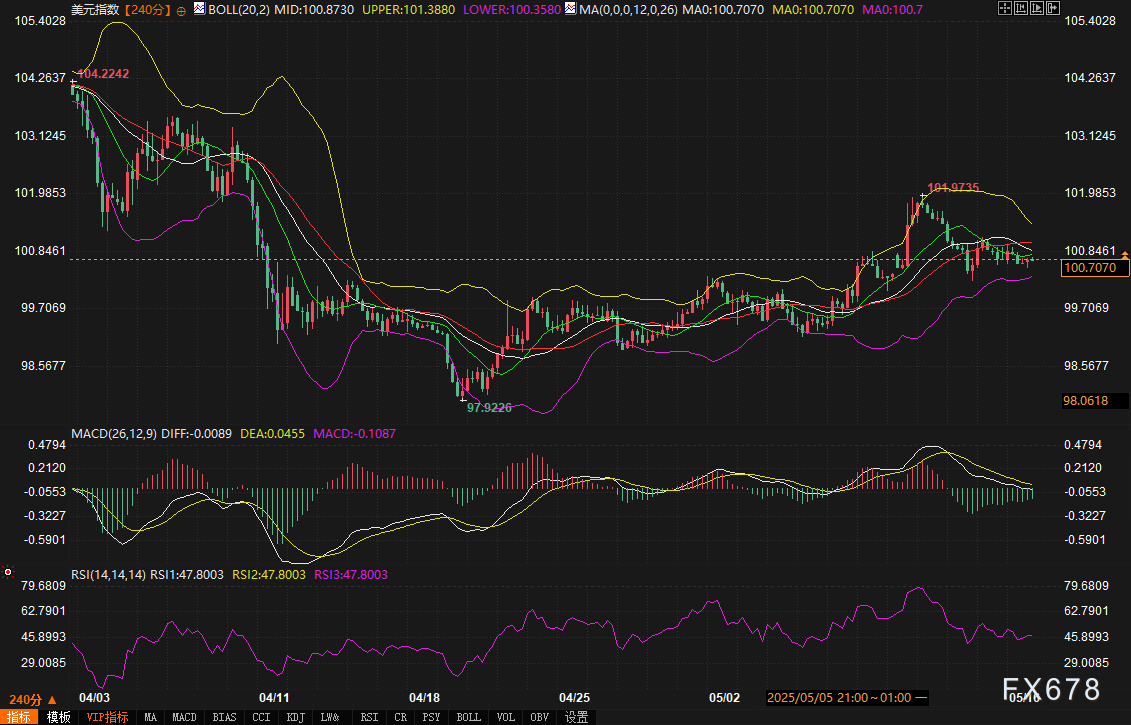从结构上看,4小时级别价格已连续多根K线收于中轨下方,若无法快速收复中轨(100.87),则向下轨(100.35)寻求支撑的概率将显著提升。需注意的是,100.35附近是4月下旬的阶段性低点,若跌破该位置,可能引发技术派资金对“双顶”形态的确认,进而加剧抛售压力;反之,若在100.35-100.87区间内出现放量反弹,则可能形成短期底部结构。