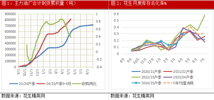 市场的供应分为长期和短期,分为显性和隐形。2024/25年度的花生整体供应压力不小,期初库存900万吨左右,直逼2021/22产季,同比上一个2023/24产季库存高21.8%,春节前后期现货都兑现了7600元/吨的价格低点,低价引发了上游惜售,下游油厂的大量采购和贸易商的备货,现货价格基本上稳定在4-4.3元/斤区间运行,主力油厂2024/25年度收购量比去年同期多50%以上。截止到目前,库存基本上从上游转移到中下游环节,也从显性库存转为隐性库存,市场可供流通量不断减少。贸易商入冷库后短期出货心理减弱,挺价心理增强,整体供应压力阶段性放缓。而需求方面,有端午和未来中秋的备货支撑,市场供大于求的惯性压力放缓,随着库存的转移和需求的支撑,边际影响也在放生一些转变。