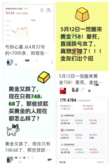 5月14日,据羊城晚报报道,有人分享了自己的贷款80万元买黄金的经历。据其表述,其成本价高达830元,现在感到非常心慌。据网友所述算了一笔账,从持仓价格的830元到现在的758元左右的价格,不算贷款利息、回收差价等,每克就已经跌掉了72元,80万元投资的损失在7万元左右。